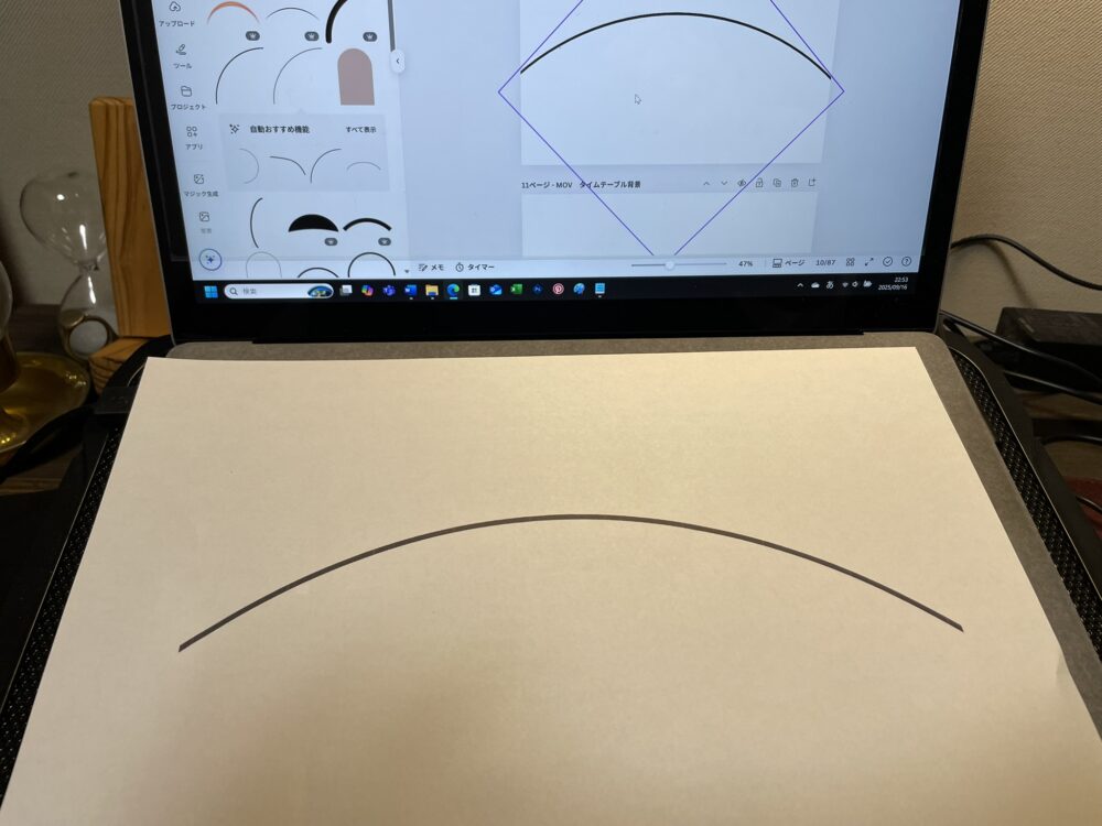 パソコンで円弧作成して、プリントアウト→ダンボールに貼り付け→切り抜き