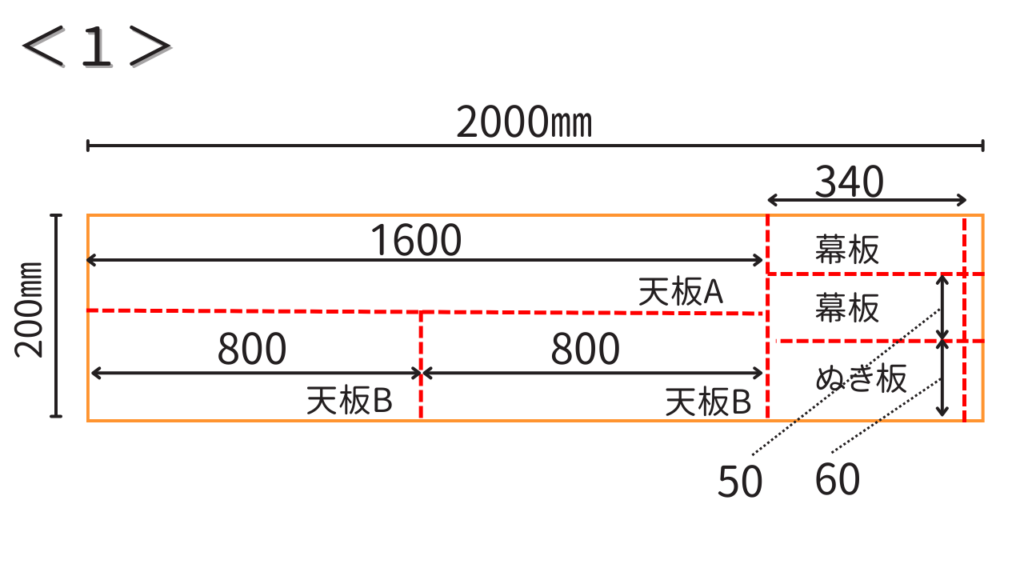 加工寸法の例としては、カフェ板の幅が200㎜なので60㎜×3本のように切り分けます。