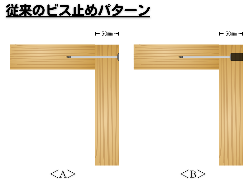 <B>ビス頭を途中まで入れ、ダボで埋める