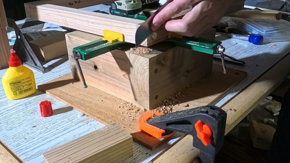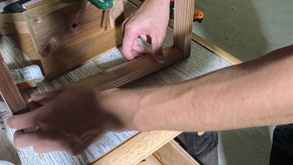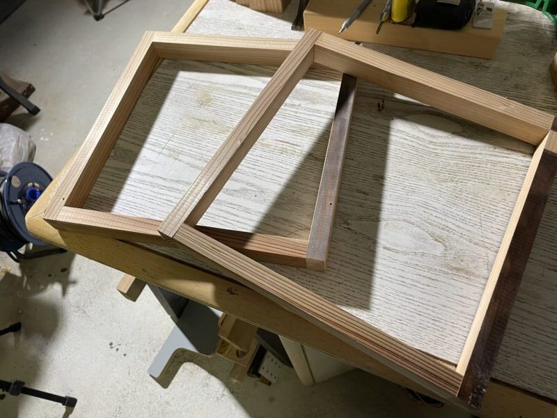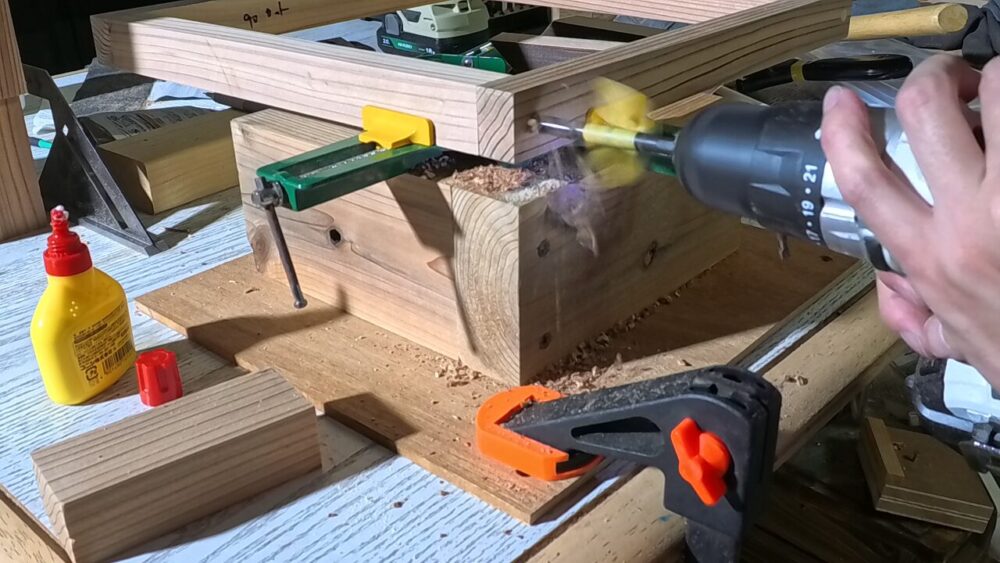 接着剤で仮止め→ビス止めという流れでフレームを組み立てます↓