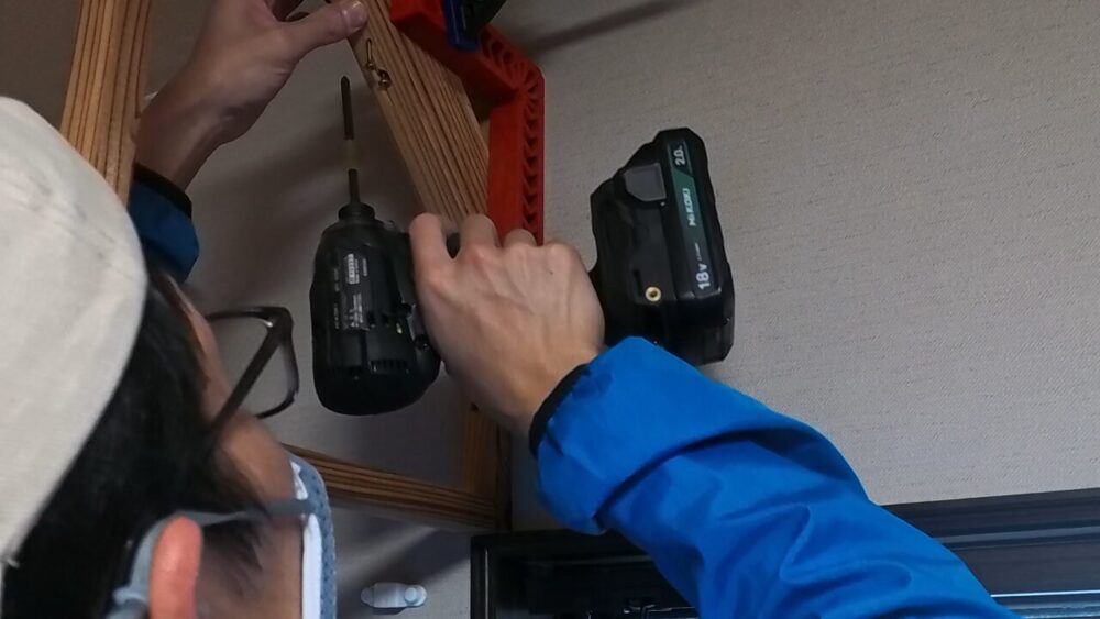 棚受けフレームの取り付け作業です。