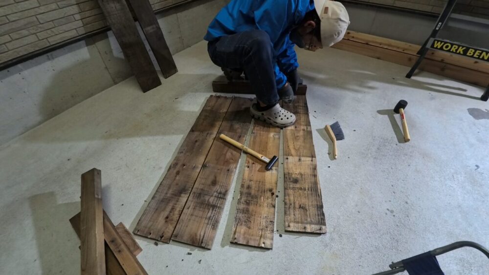 廃材のパレットを再構築して、壁に掛けて使えるパレットラックを作りました。
