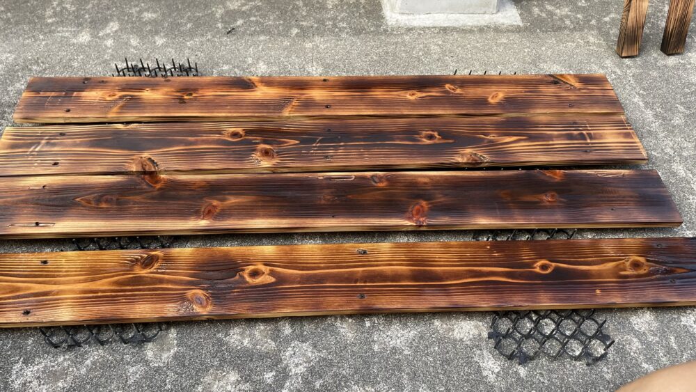 今回は、安価で手に入る野地板を使って焼杉のすのこにした様子を紹介します。