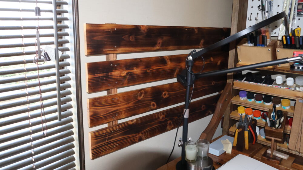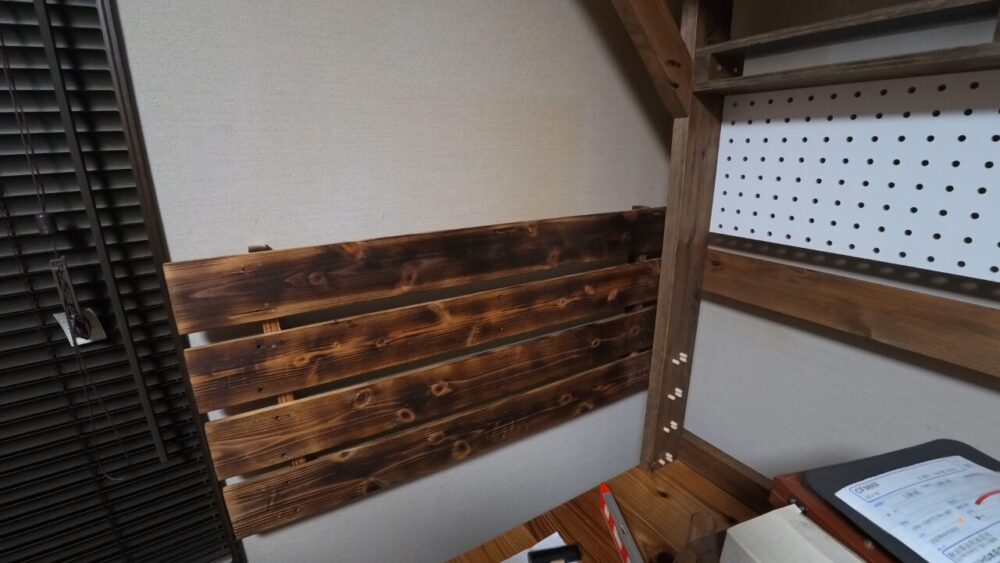 焼杉のすのこを自作し、壁面収納として活用するまでの作業を紹介しました。